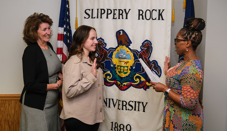 From left, Slippery Rock University President Karen Riley attends a ceremony in Old Main where SRU student Charli Severo was sworn in as a member of the SRU council of trustees by Shannon Young, administrative assistant in human resources and notary public of the University.